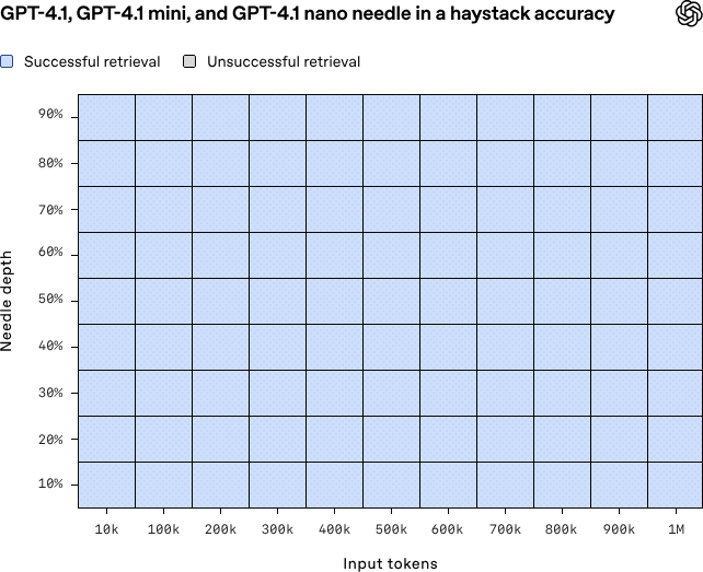 大海捞针评估中,GPT-4.1、GPT-4.1 mini 和 GPT 4.1 nano 都能够在最远 1M 的环境中检索所有位置的针。