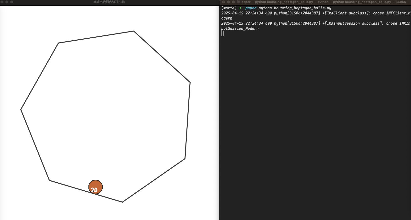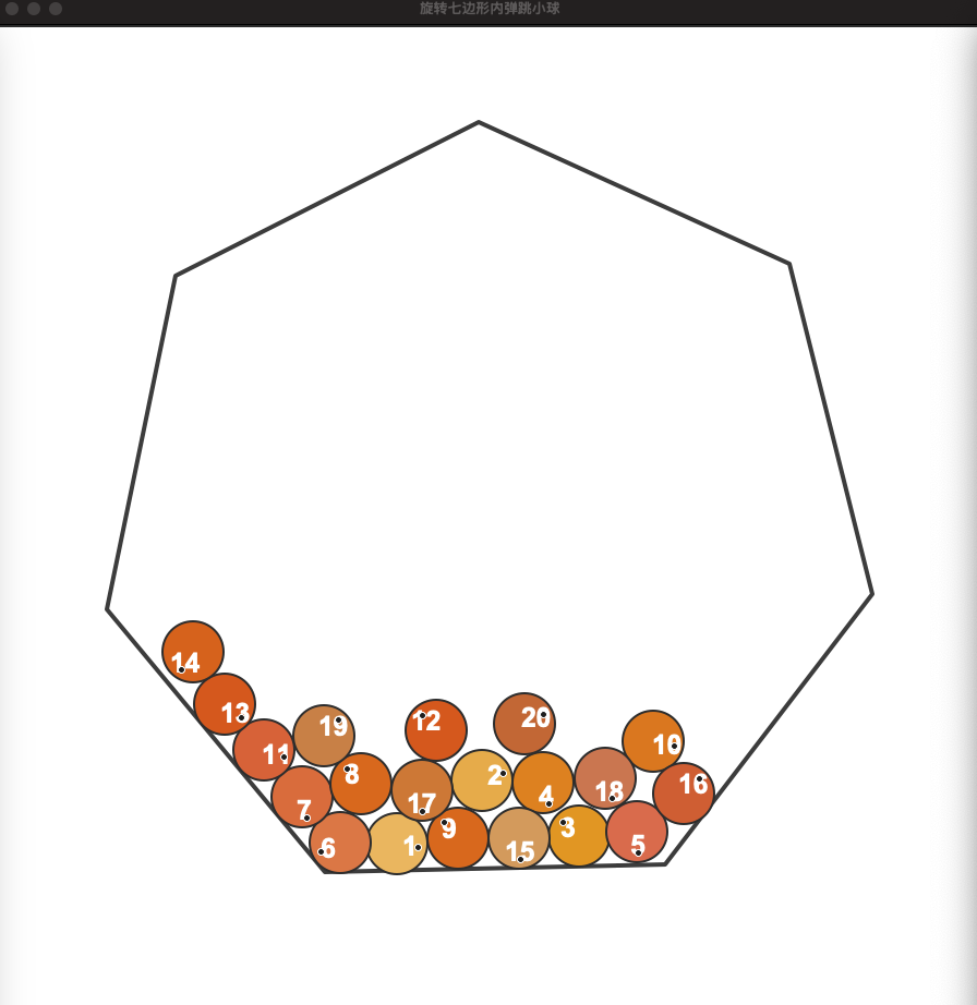 - 小球应受到重力和摩擦力影响,并能真实地与旋转的七边形边界发生弹跳。小球之间也应有碰撞。