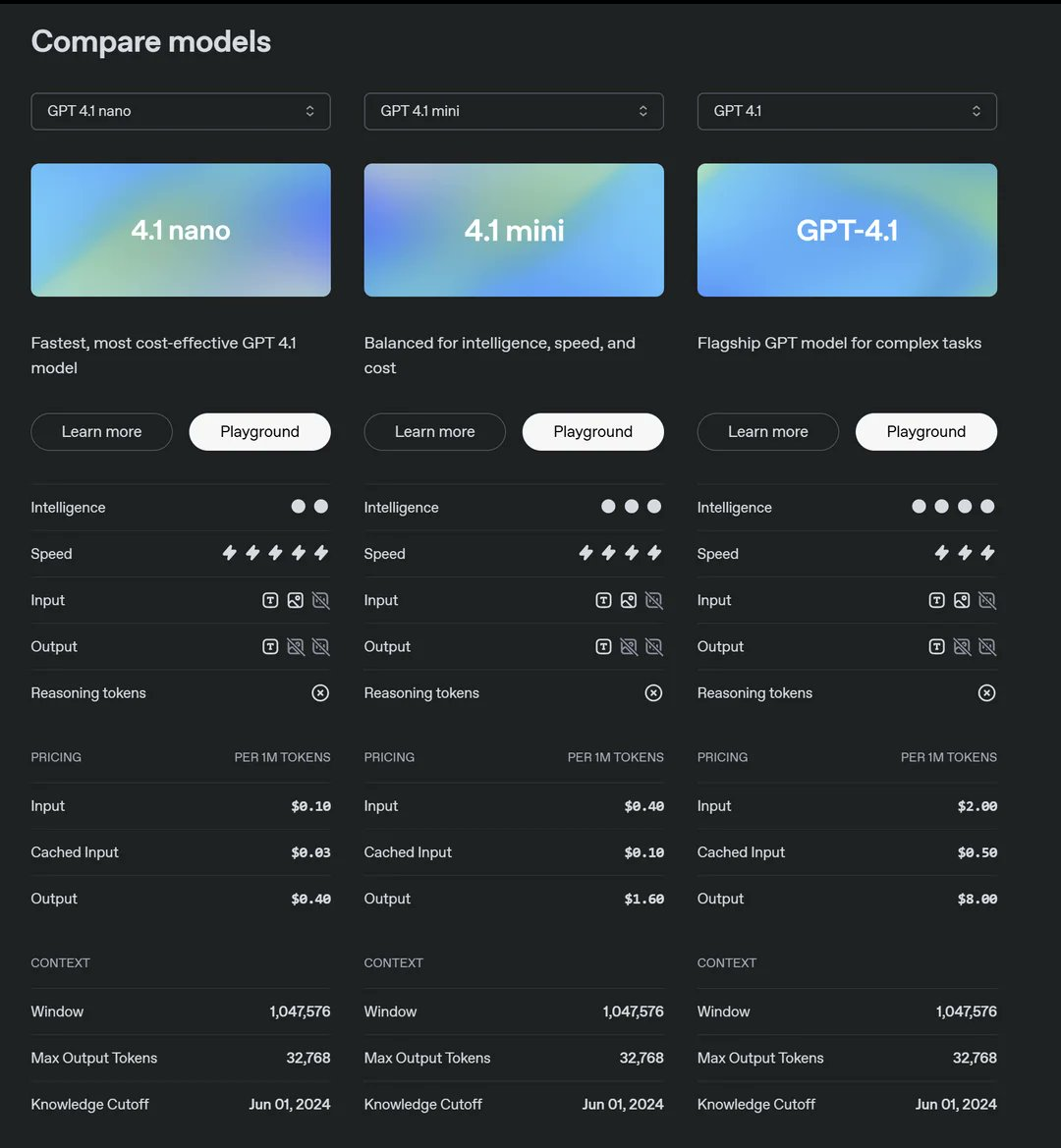 OpenAi 又发新模型了,新推出的 GPT - 4.1 系列模型,包括 GPT - 4.1、GPT - 4.1 mini 和 GPT - 4.1 nano,官网介绍:它们在编码、指令遵循、长上下文处理等方面有显著提升,且成本更低。在编码能力上,GPT - 4.1 在 SWE - bench Verified 测试中得分 54.6% ,远超 GPT - 4o 和 GPT - 4.5,在多种编码任务上表现出色。