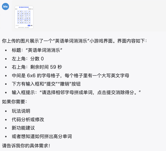 把游戏截图画面给GPT-4.1,识别没有问题,但是对相邻字母没有理解到位