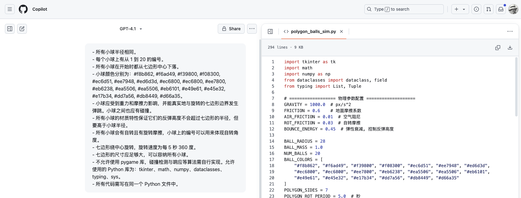 - 所有代码需写在同一个 Python 文件中。结果:代码生成很快,运行顺畅无 bug,但是只有一个球。