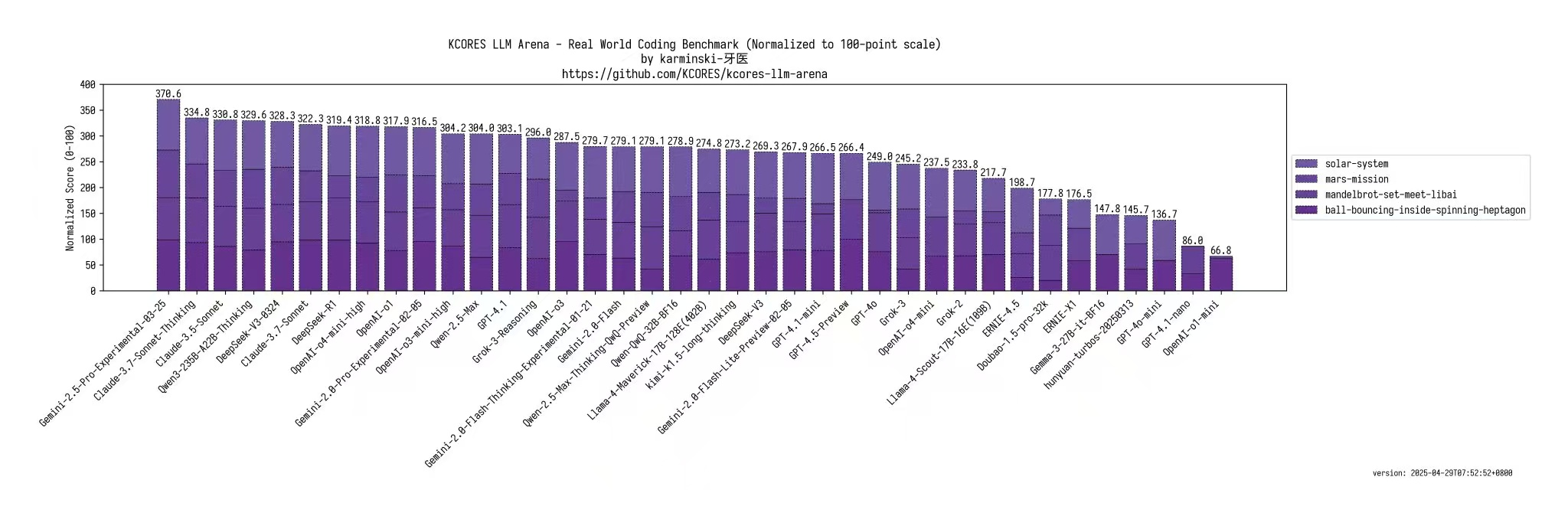 每个测试都发挥很稳定,这导致最终得分特别高,得分 329.6 分,排在了排行榜的第四名!是目前开源模型第一名!