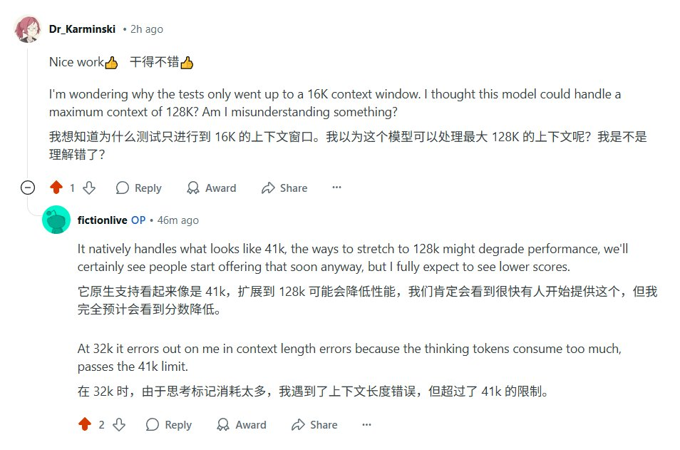 Qwen3-235b-a22b 在“0”token 测试中得分 100.0,随着上下文长度增加,成绩有所下降,在 4k 时得分 69.0,16k 时得分 67.7,大于 16K 上下文,Fiction 未作测试。