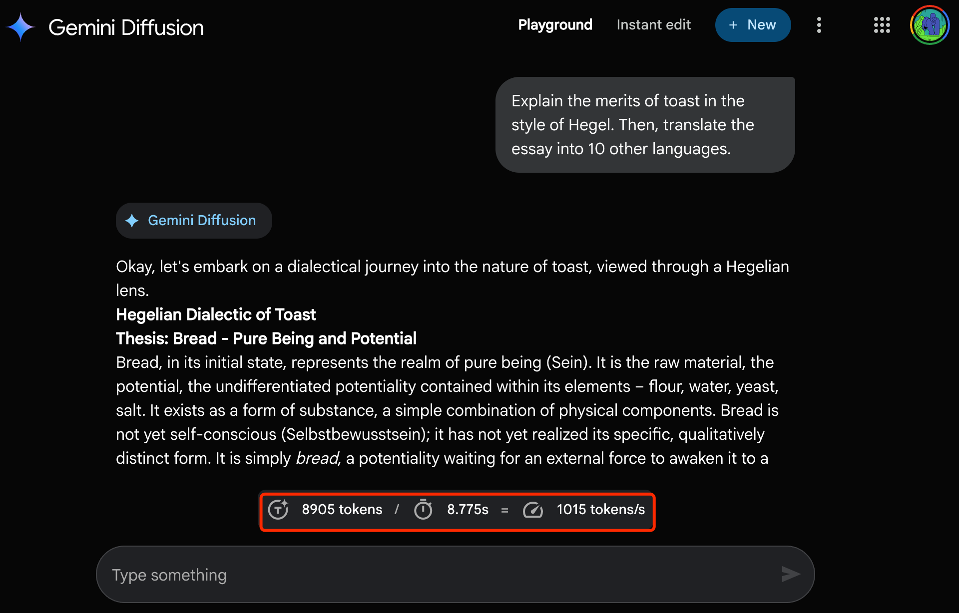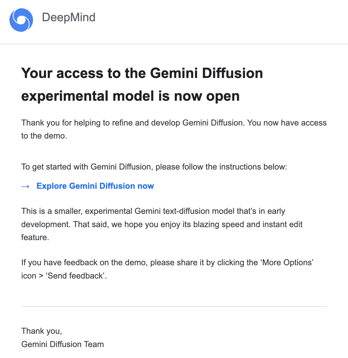 这个有空再细看,这倒让我想起 5 月 Google 开源的 Gemini Diffusion,当时就申请了 Waitlist,很久没打开 Gmail,发现 5 月 29 就收到 access 的邮件了